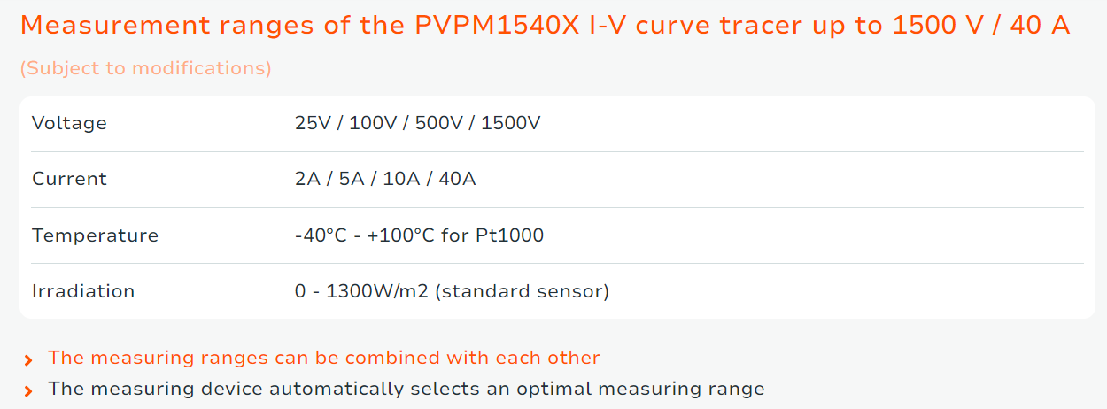 PVPM1540X的電子元件是專門為現代高效光伏組件的測量而開發的,特別是針對極高短路電流(Isc)的應用。