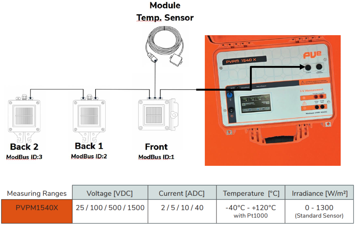 新一代PVPM是為雙面測量而準備的。每個設備都配備了一個前端輻照度感測器,並可選擇擴展兩個額外的輻照度感測器。